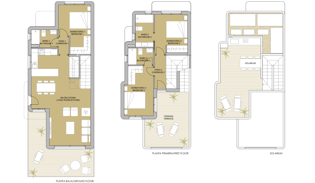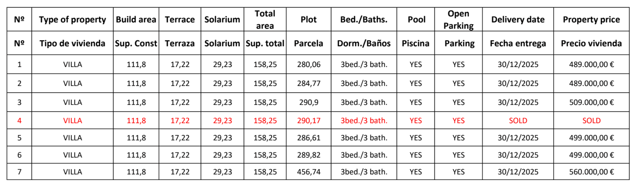 Jede Villa verfügt über 3 geräumige Schlafzimmer und 3 elegante Badezimmer, während die offene Gestaltung des Wohnzimmers mit Küche und Essbereich einen hellen, einladenden Raum mit großen Verglasungen schafft, die das natürliche Licht hereinlassen. Der Wohnbereich geht nahtlos in den privaten Garten über, der einen Swimmingpool und eine Terrasse bietet, die zum Entspannen oder für gesellige Runden einlädt. Ausgedehnte Terrassen und elegant gestaltete Außenbereiche ermöglichen es Ihnen, den spanischen Lebensstil in vollen Zügen zu genießen.