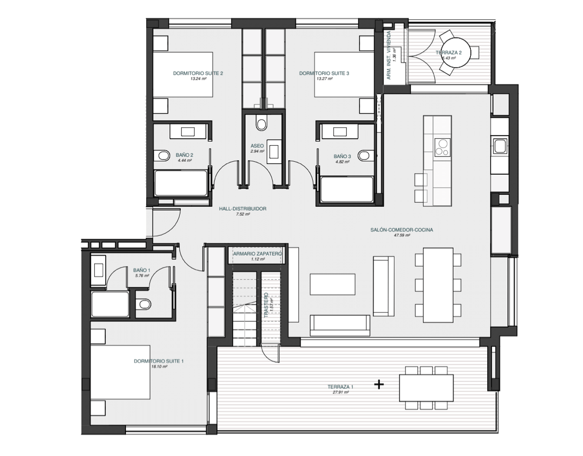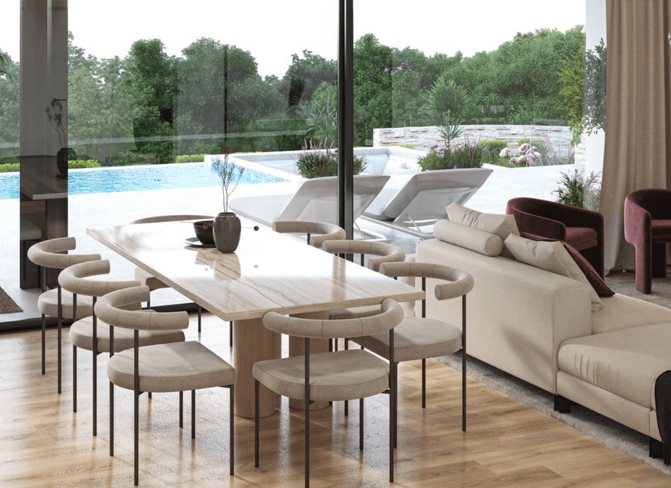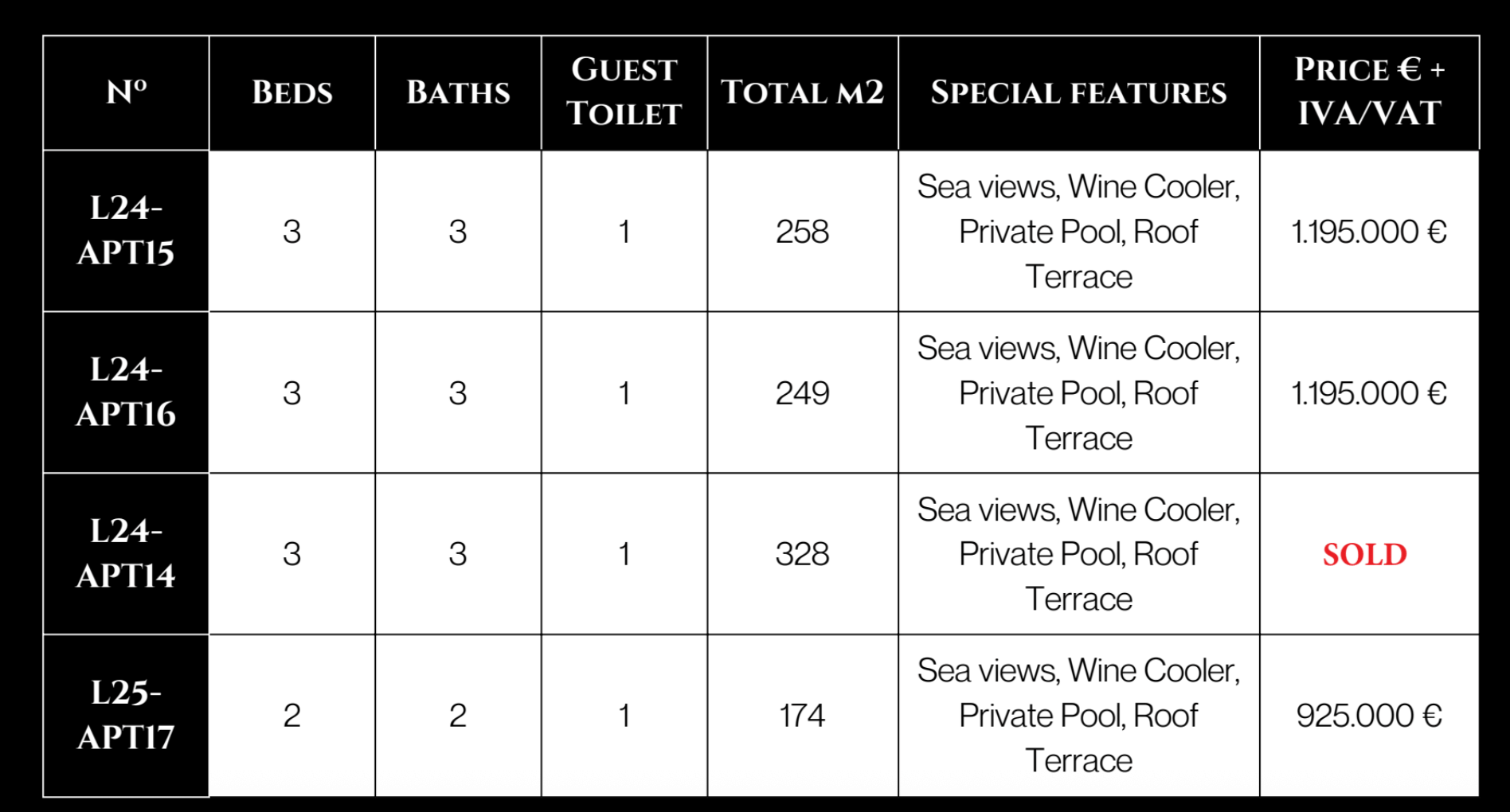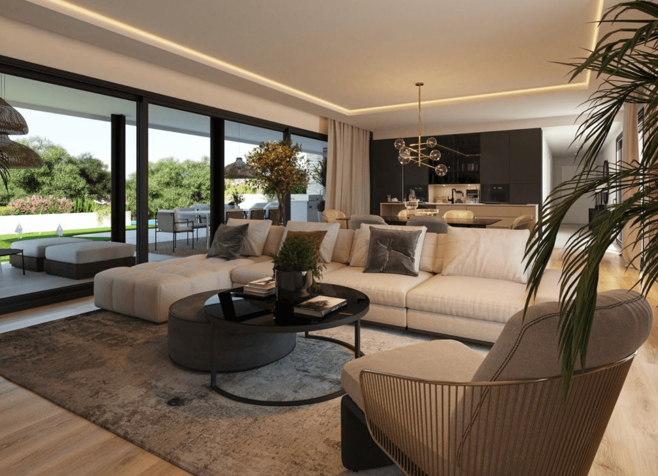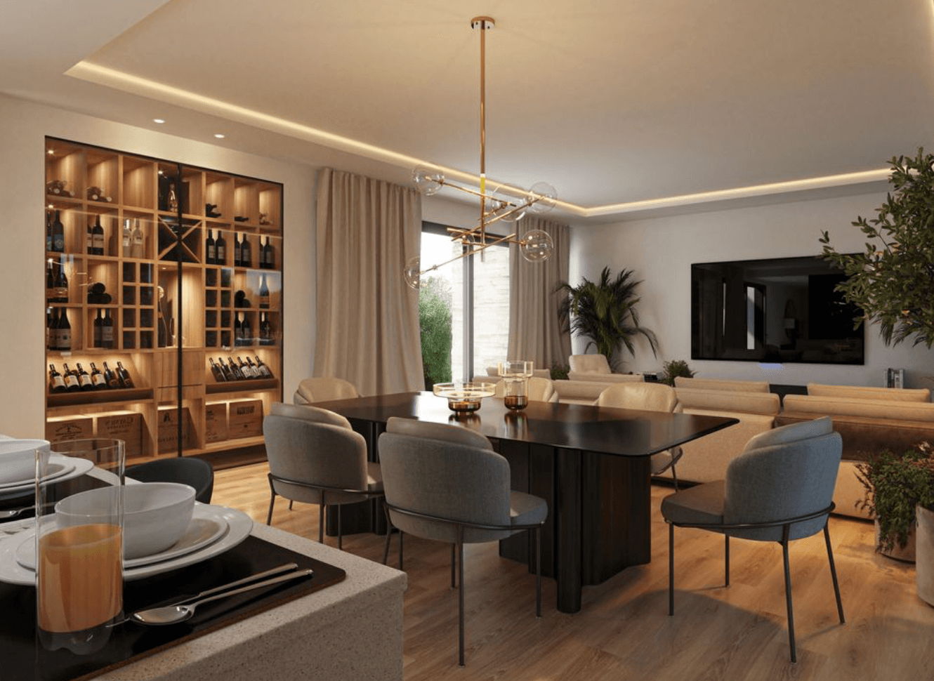 Każde mieszkanie zostało zaprojektowane tak, by wnętrza były jasne i przestronne — duże przeszklone okna łączą salon i sypialnie z tarasami. Modele z parteru posiadają prywatny basen, natomiast penthouse’y oferują prywatne solarium, letnią kuchnię oraz dodatkowe udogodnienia. W standardzie znajdziesz ogrzewanie podłogowe, system Smart Home kontrolujący rolety, oświetlenie i temperaturę, wysokiej klasy AGD i starannie dobrane materiały wykończeniowe.