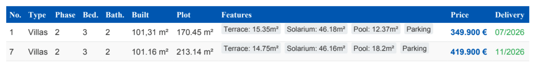 Każda willa posiada prywatny basen oraz zadaszone miejsce garażowe. Nieruchomości są typu dwupoziomowego, z przestronnymi tarasami i solarium wyposażonym w letnią kuchnię z przyłączami do urządzeń AGD. Wnętrza zaprojektowano z dbałością o detale – kuchnie są w pełni umeblowane i wyposażone w sprzęt AGD, łazienki posiadają kabiny prysznicowe i lustra, a klimatyzacja jest przygotowana do instalacji. To doskonała propozycja dla osób szukających willi z basenem Hiszpania lub nowych apartamentów w Hiszpanii na sprzedaż w regionie o wysokim potencjale inwestycyjnym.