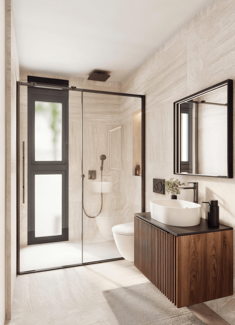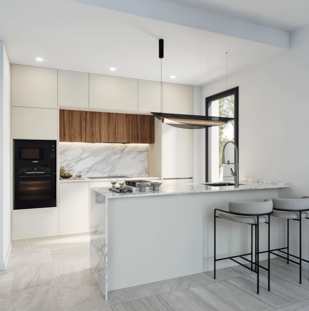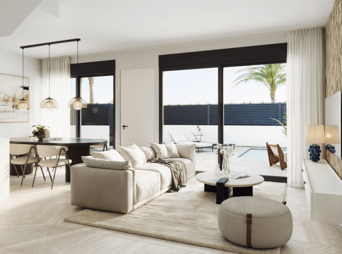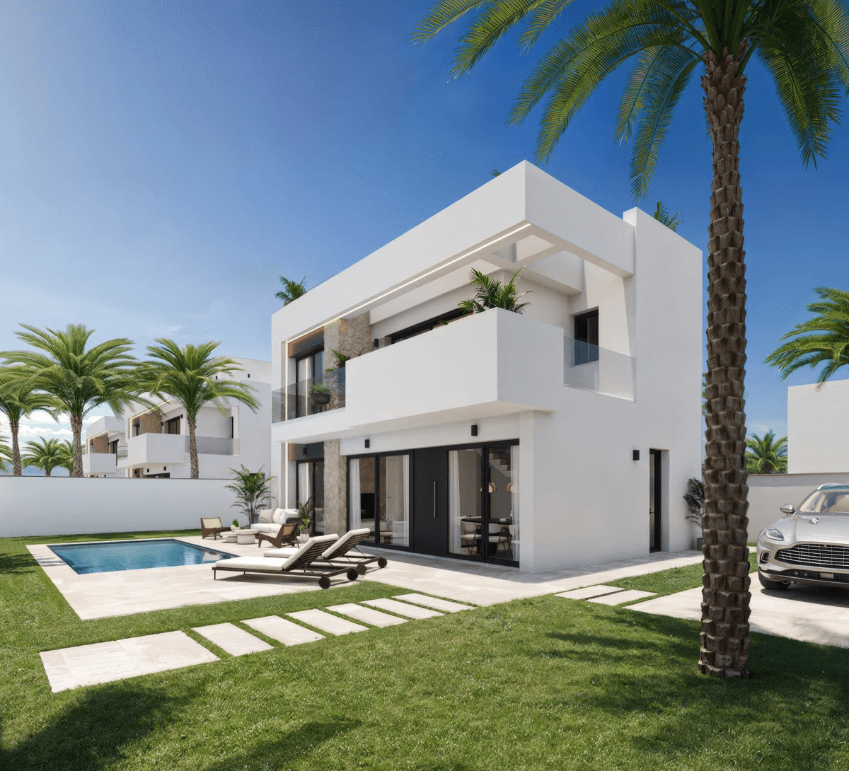 Każda willa została zaprojektowana z myślą o maksymalnej wygodzie i nowoczesnym stylu życia. Do dyspozycji mieszkańców pozostają trzy przestronne sypialnie z wbudowanymi szafami, trzy eleganckie łazienki, jasny salon z jadalnią oraz kuchnia na otwartym planie. Duże przeszklenia otwierają wnętrze na prywatny ogród z tarasem i basenem, a dodatkową przestrzeń do relaksu oferuje solarium na dachu z możliwością instalacji jacuzzi i letniej kuchni. W cenie znajduje się także piwnica, idealna do stworzenia siłowni, sali kinowej, biura lub dodatkowej sypialni.