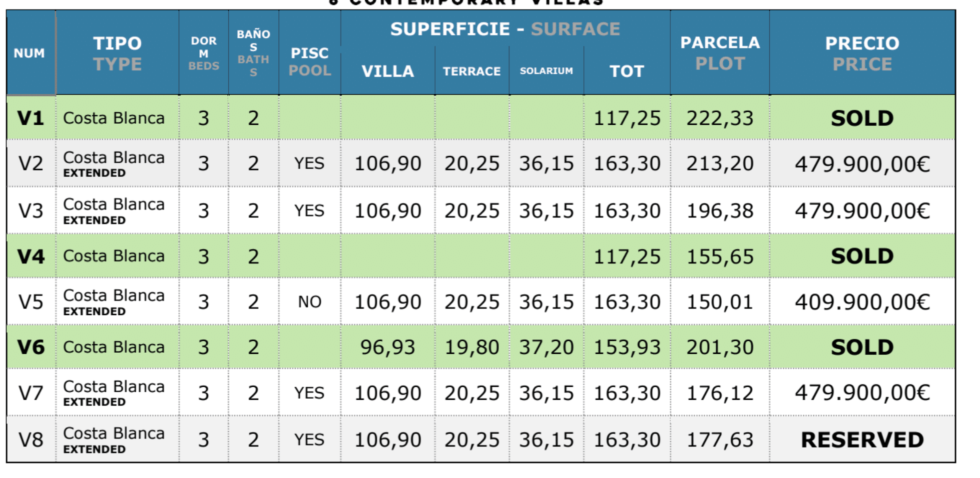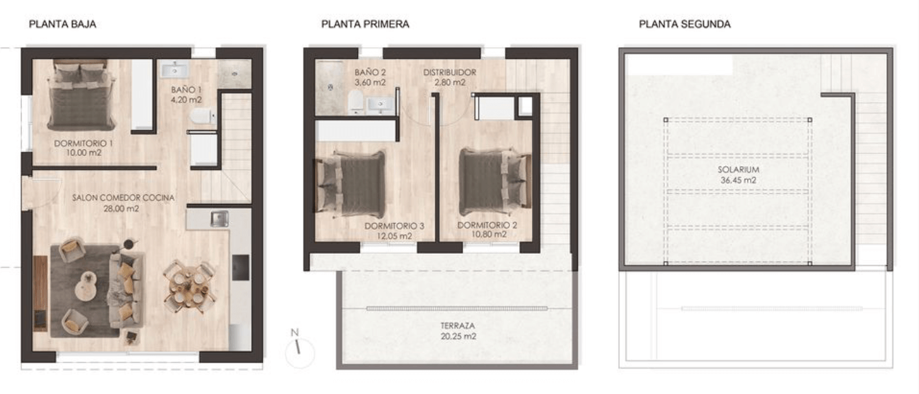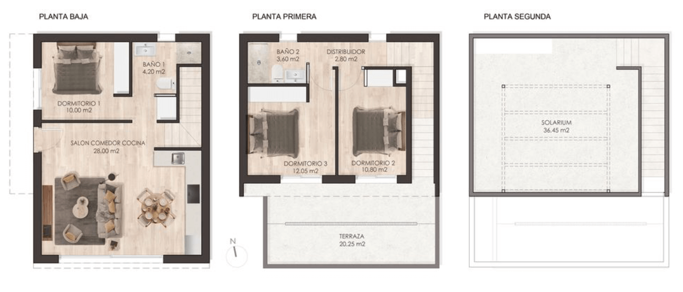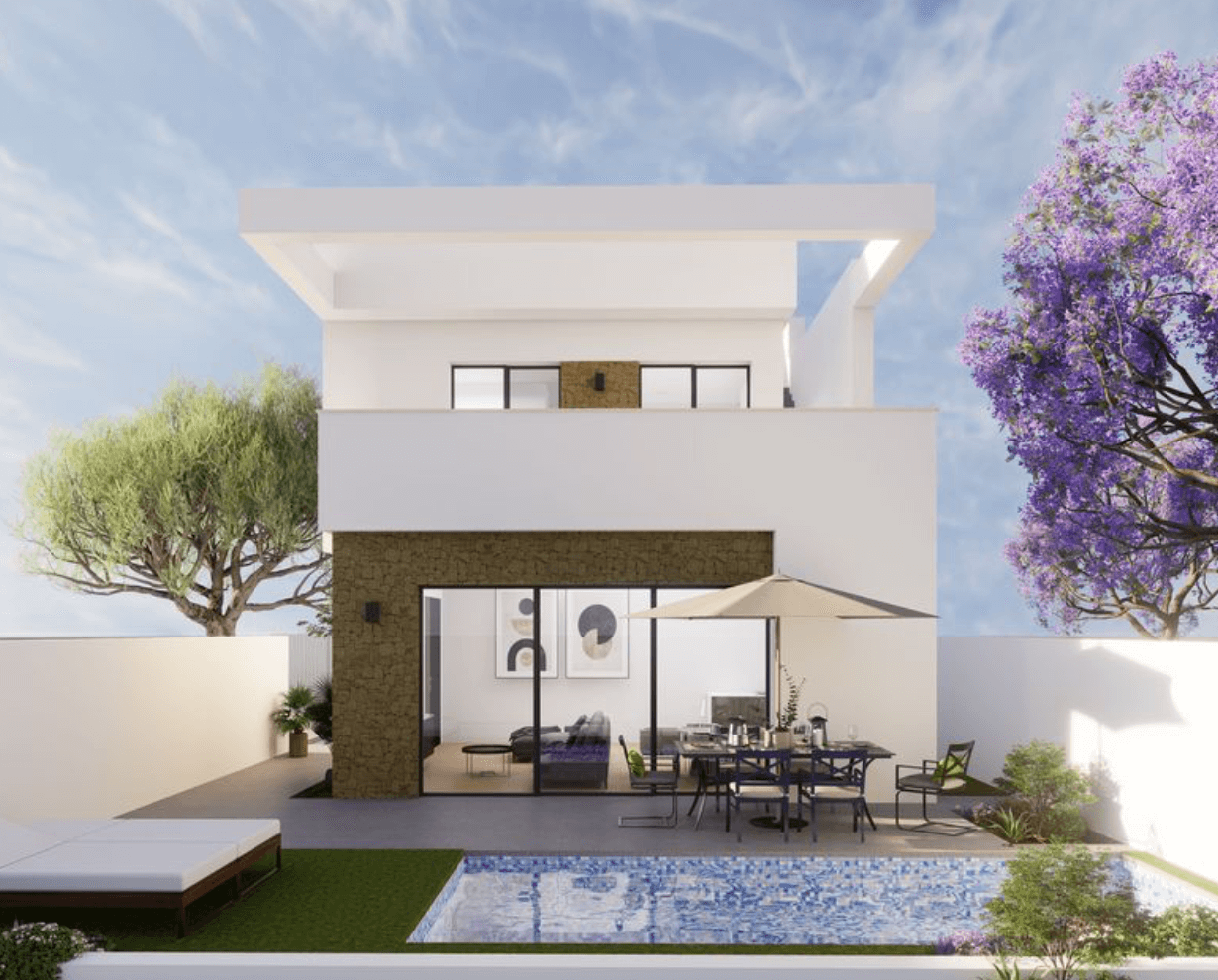 Te eleganckie, nowo wybudowane wille oferują 3 sypialnie i 2 łazienki, a ich układ został zaprojektowany z myślą o wygodnym stylu życia nad Morzem Śródziemnym. Na parterze znajduje się przestronny salon połączony z kuchnią w stylu amerykańskim, sypialnia z łazienką oraz weranda wejściowa z wyjściem do ogrodu i prywatnego miejsca parkingowego. Na piętrze do dyspozycji są kolejne dwie sypialnie, łazienka oraz tarasy idealne do relaksu i podziwiania hiszpańskiego słońca.