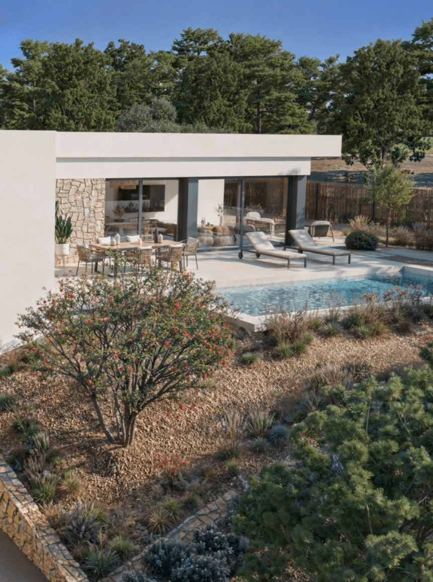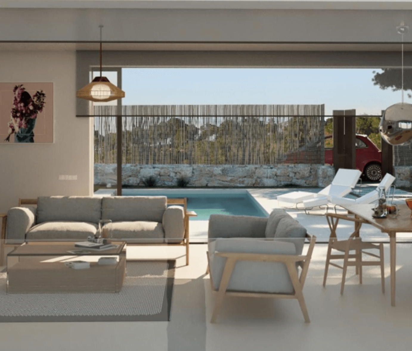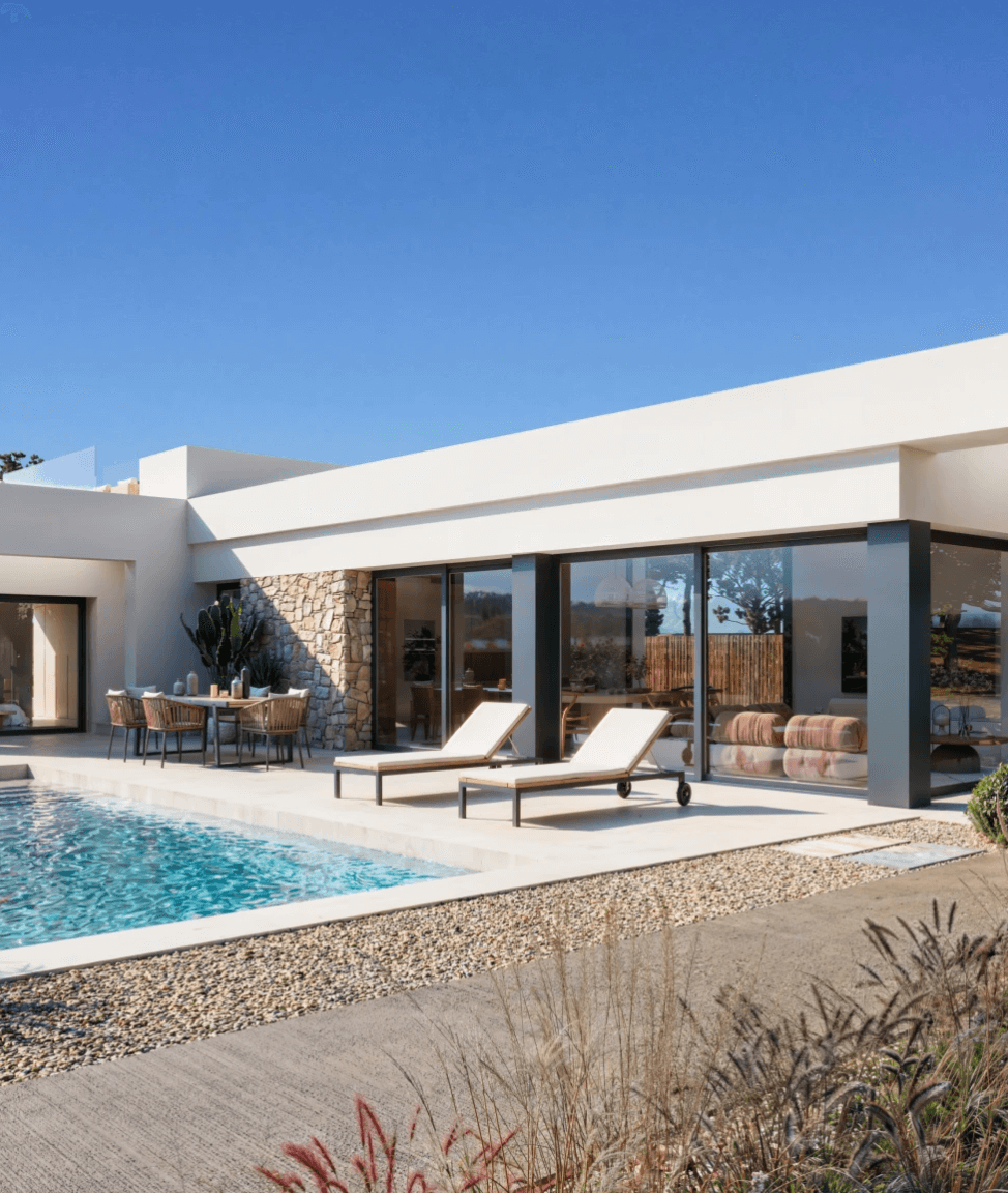 Willa charakteryzuje się nowoczesnym designem i wysokiej jakości wykończeniem. Składa się z trzech sypialni, dwóch łazienek (jedna en suite), toalety dla gości, przestronnej kuchni otwartej na salon oraz dużego garażu. Dodatkowo, nieruchomość wyposażona jest w solarium o powierzchni 27,75 m² oraz prywatny basen o powierzchni 29,75 m². Wszystkie pomieszczenia zostały zaprojektowane z myślą o komforcie i funkcjonalności, oferując przestronność i elegancję.
