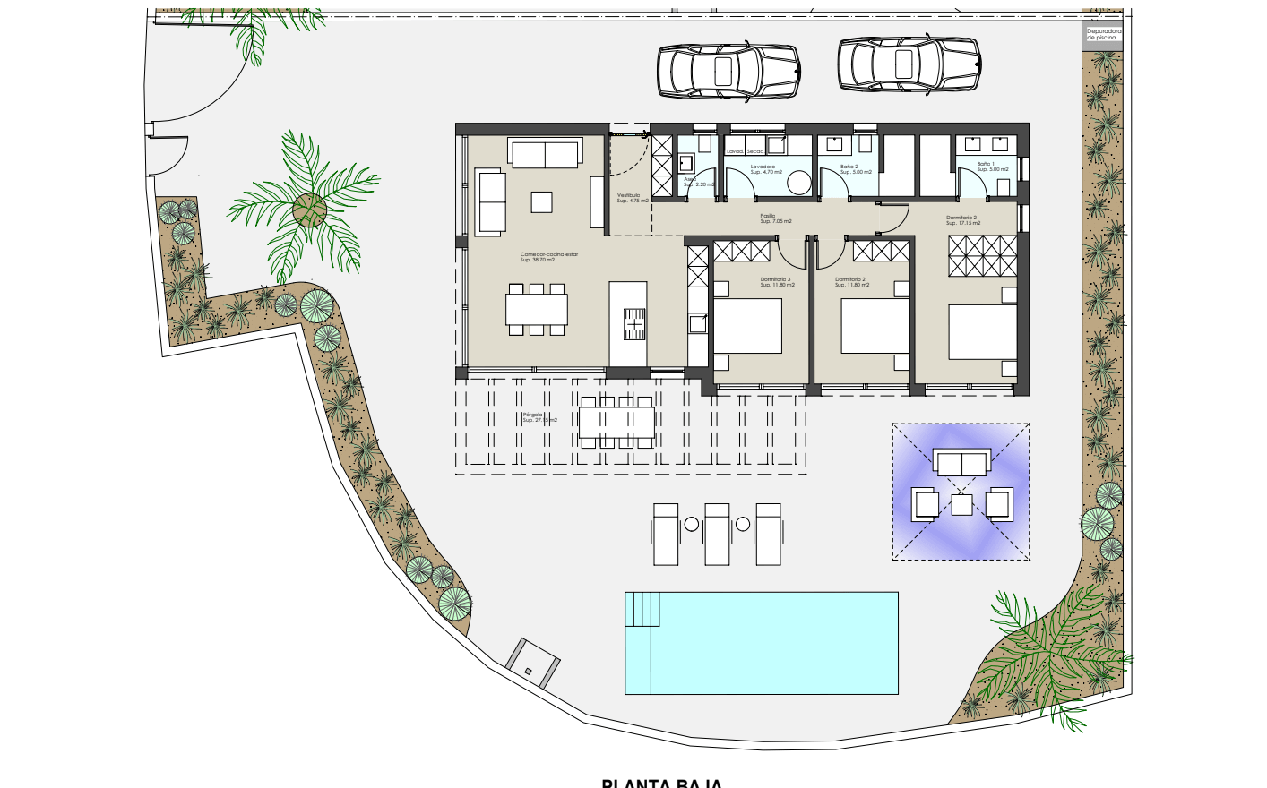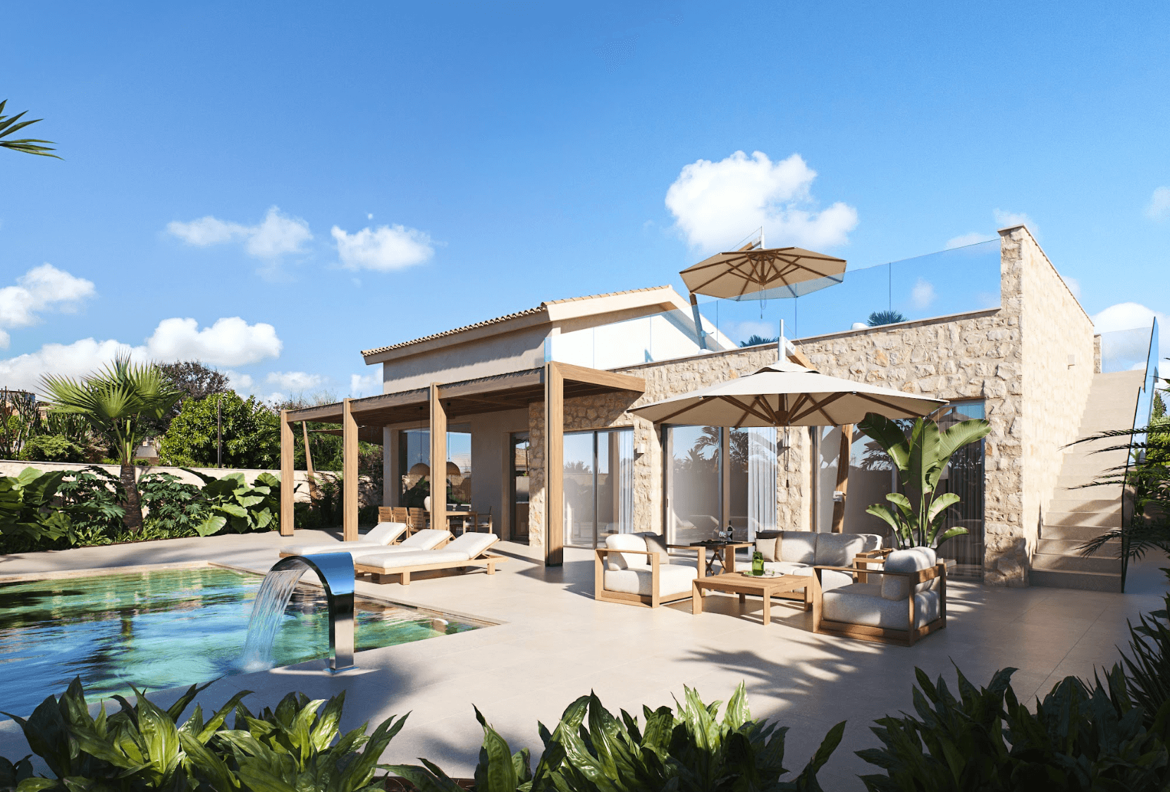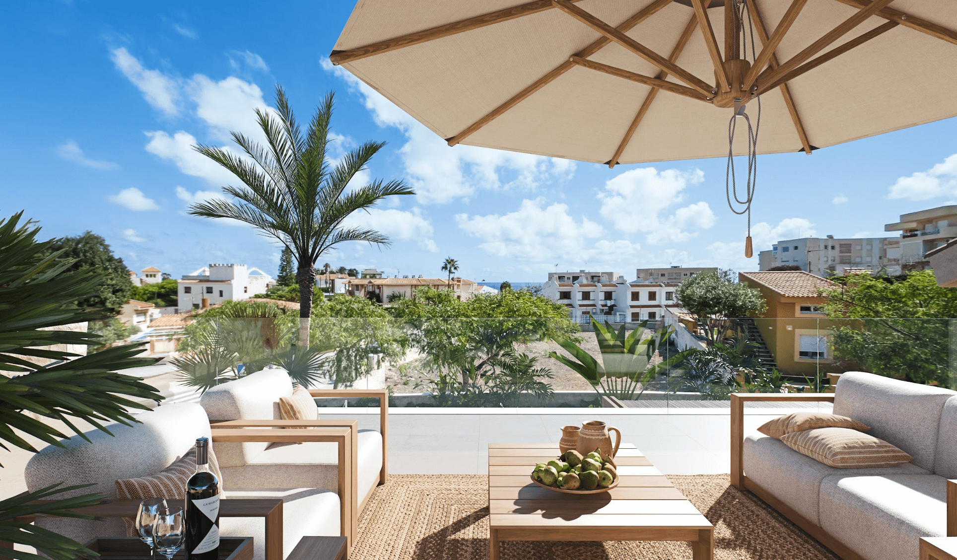 W nieruchomości znajdują się 3 sypialnie, w tym główna z prywatną łazienką typu en-suite, oraz dodatkowa łazienka dla gości i pralnia. W ogrodzie zaprojektowano prywatny basen (8×3 m) otoczony roślinnością śródziemnomorską, a na dachu znajduje się solarium o powierzchni 68 m², z którego można podziwiać panoramiczne widoki na morze i cieszyć się słońcem przez cały rok. Ta luksusowa nieruchomość w Hiszpanii została wyposażona w liczne udogodnienia: oświetlenie LED wewnętrzne i zewnętrzne, system klimatyzacji, podwójne szyby dla lepszej izolacji, system bezpieczeństwa z kamerami oraz automatyczne nawadnianie ogrodu. Wszystko to zapewnia pełen komfort i bezpieczeństwo mieszkańców.