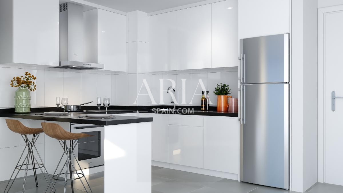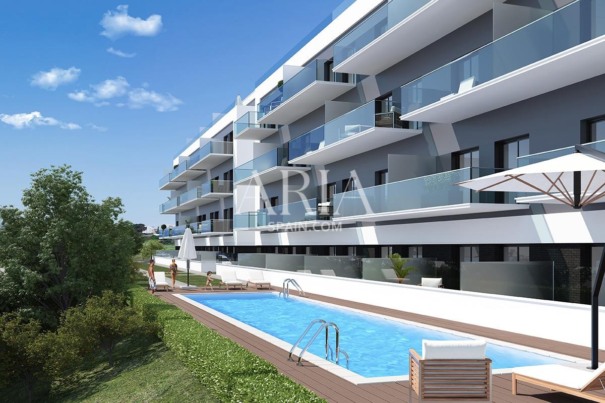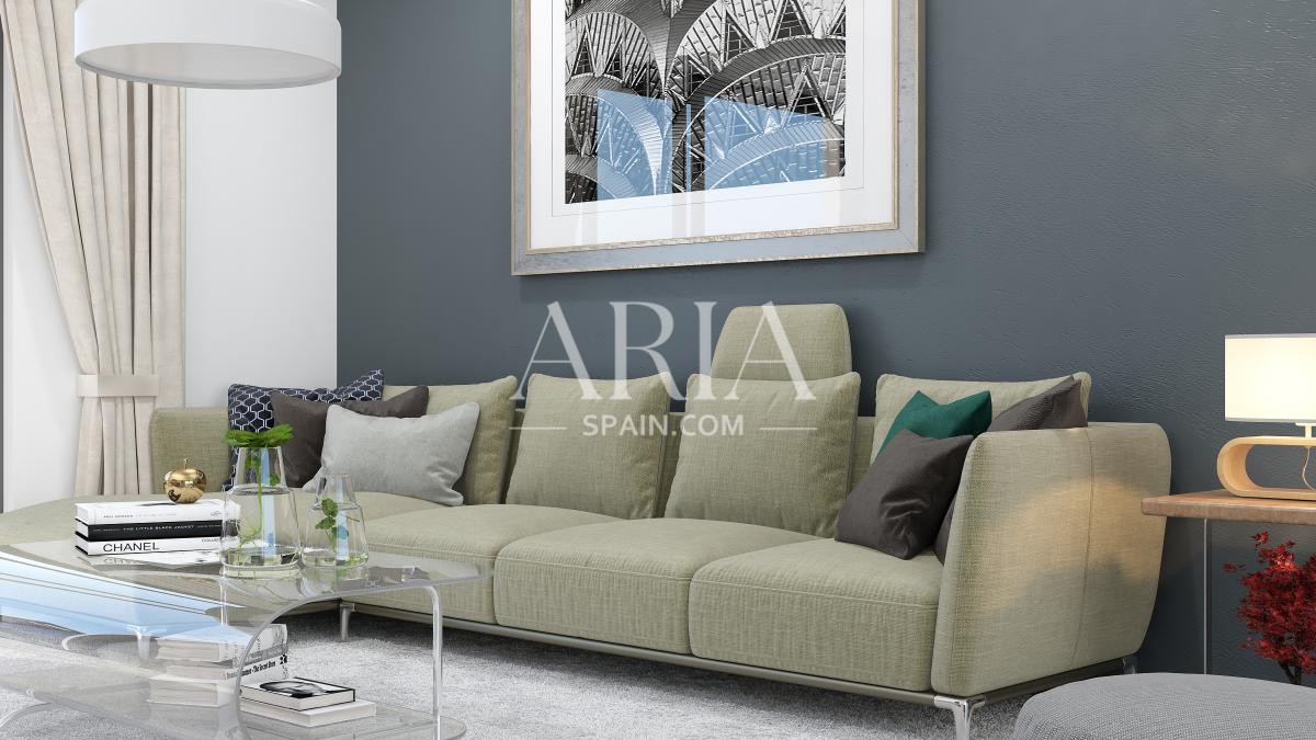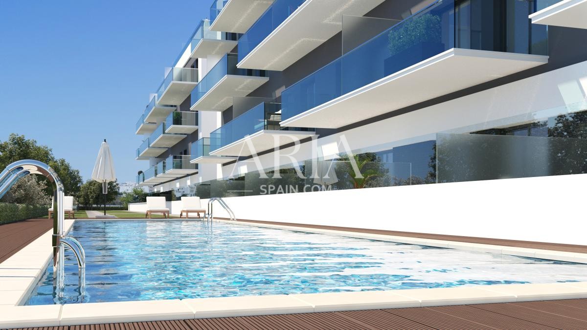 The properties are equipped with furnished and fully equipped kitchens, as well as air conditioning systems. Located within a gated community, residents will enjoy beautiful landscaped areas and an outdoor swimming pool. These modern apartments are priced between 167,500 € and 219,500 €, with sizes ranging from 52 m² to 76 m².