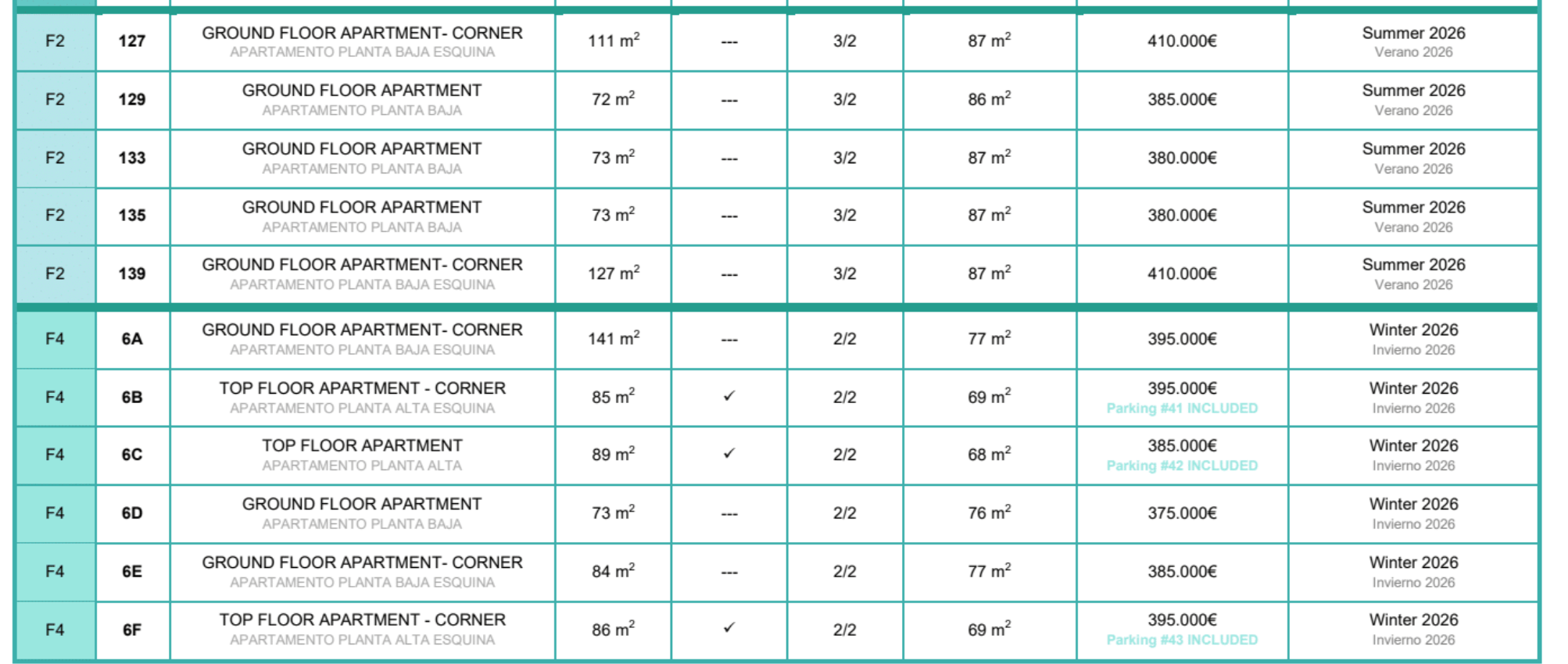 Hver lejlighed har en lys stue med åbent køkken og spiseplads, 2 eller 3 soveværelser med indbyggede garderobeskabe og 2 fuldt udstyrede badeværelser. Standarden omfatter også hårde hvidevarer i køkkenet og gulvvarme, ikke kun i badeværelserne, men også i stuen og køkkenet, hvilket øger komforten betydeligt. Lejlighederne har privat parkering og en fælles pool omgivet af et loungeområde.